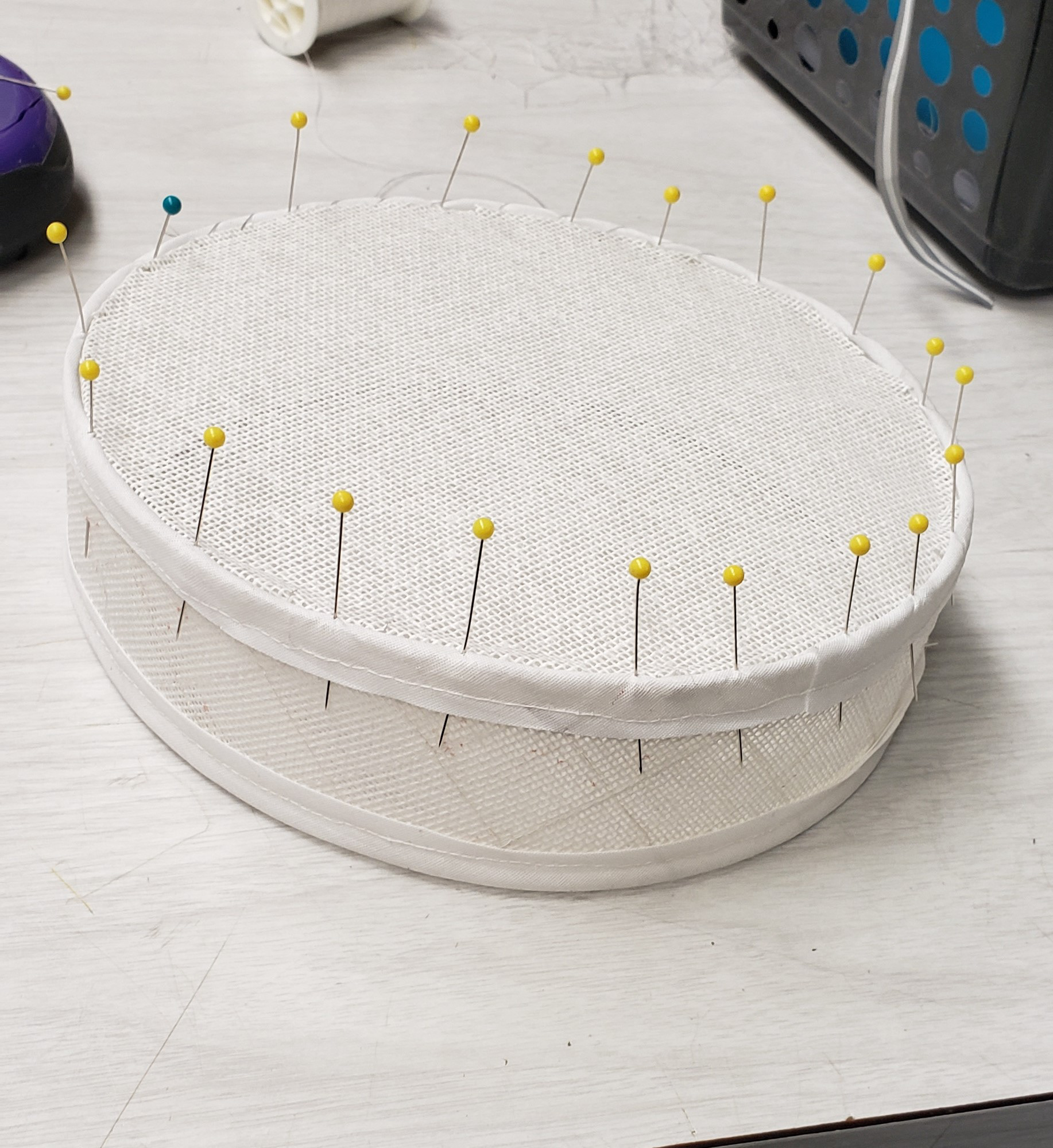I cut a single piece of buckram into an oblong shape for the top of the hat. I cut tabs into the seam allowance and hand stitched the top into the crown, making sure that the tabs were on the inside. then i pinned and hand stitched the fashion fabric to the top, very slightly stretching it.