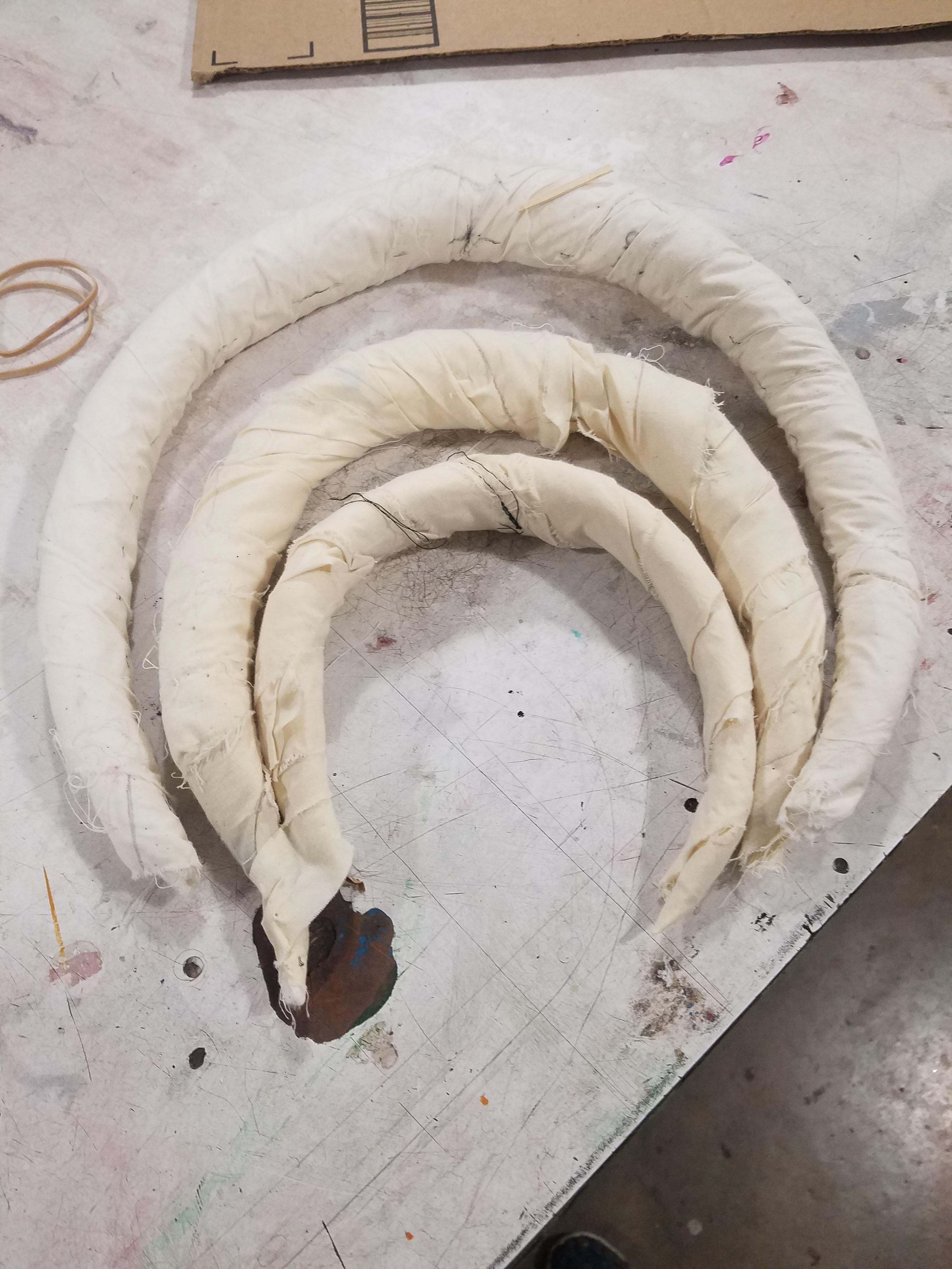 To make the brim, I made three increasingly large bands out of clay and fabric. I used these to stabilize the fosshape as I steamed it into shape. I found that I had to steam one curved shape at a time, which was challenging because I used one piece of material for the whole brim, not one per shape.